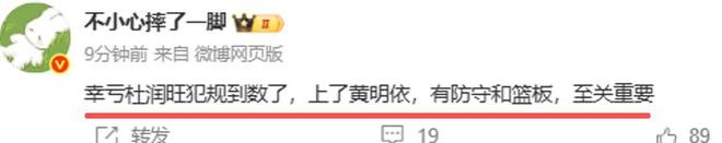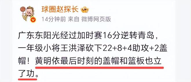 虽然黄明依得分不如队友多,但是却得到媒体人和球迷的怒赞,赵探长说,“广东东阳光经过加时赛16分逆转青岛,一年级小将王洪泽砍下22+8+4助攻+2盖帽!黄明依最后时刻的盖帽和篮板也立了功。”另一媒体人说“幸亏杜润旺犯规到数了,上了黄明依,有防守和篮板,至关重要”,球迷夸:“黄明依最后时刻的盖帽和篮板立下了汗马功劳”,“黄明依不错,可以防守,可以抢板,可以得分,不比杜锋的爱酱18/25防守好吗?”球迷说得很对,杜锋瞧不起的队员,偏偏是他拯救了杜锋。你说神奇不?