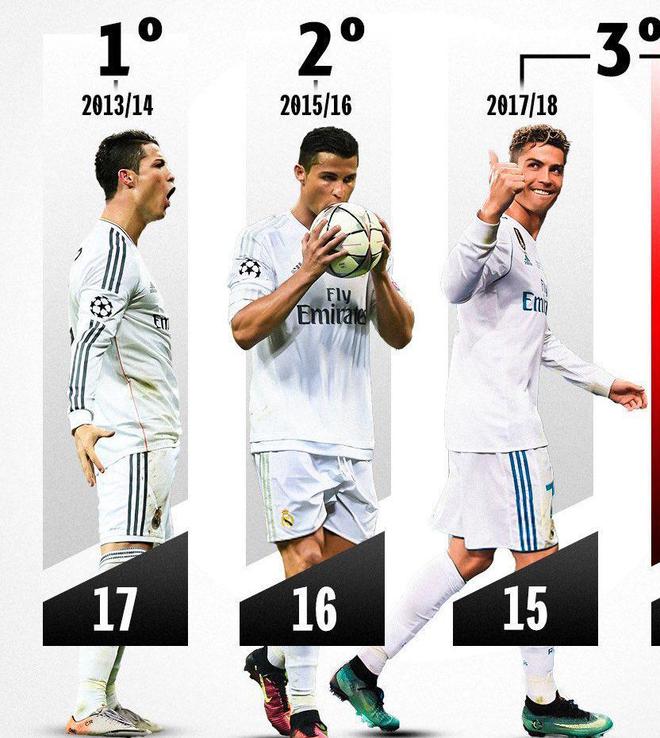 C罗在2013-14、2015-16、2017-18三个赛季分别打进17、16、15球,包揽历史前三。更罕见的是,这三个赛季他都随皇马夺冠。